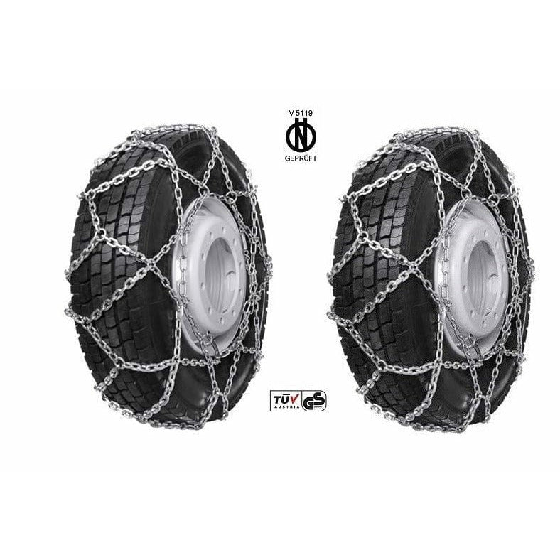 Robuste, beidseitig verwendbare Schneeketten aus Vierkant-Gliedern – TÜV Austria (V5119) zertifiziert. Perfekt für maximale Sicherheit auf Schnee und Eis.